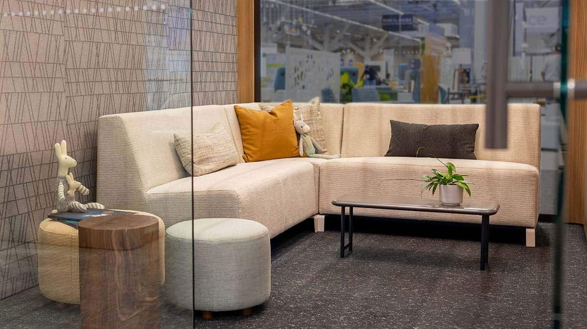 “There’s been a lot of research recently around ‘sensory touches,’ focused not only on the products themselves but also about the feeling you get when you walk into a room, what you hear, what you see, what you smell. So we added a sensory touch to each room. One room had a ton of plants in it to tell the story of biophilia, so you picked up an evergreen smell, but there was also the sound of a forest. This has been proven to have a calming effect on both visitors and patients, because it not only transports you to another place mentally; it also masks the normal sounds and smells you encounter that can add stress to your situation.