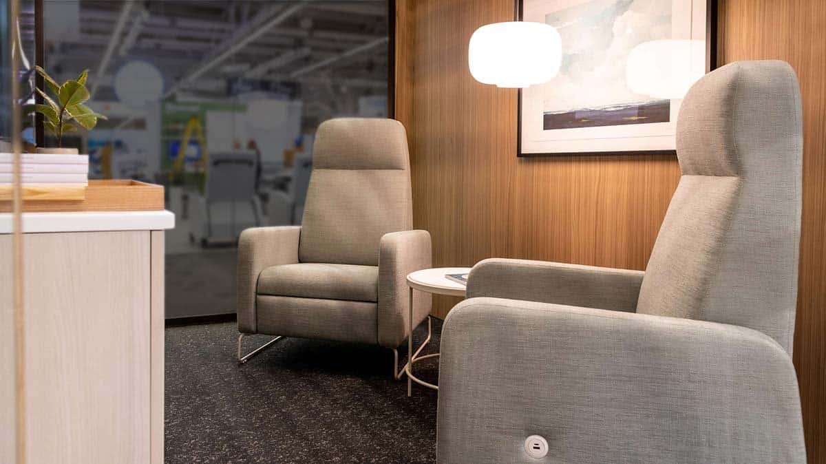 “I’ll give you a great example,” says Lauren Morgan, Brand Manager for Carolina, OFS’ healthcare and senior living furniture division. “At the last Healthcare Design Conference we had these individual waiting spaces, and we wanted to tell a story around having more privacy, especially with the pandemic and people wanting to feel safe in confined areas.