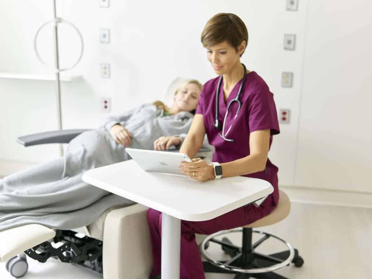 “It’s a standard on our overbed table, with a spill groove shaped into the panel, and we use it on our ‘Stray’ mobile table, with a 3DL top and poly cubby underneath,” says Schaefer. “It’s a portable nurse’s table for a laptop or other items with applications that can extend past healthcare to other markets.”